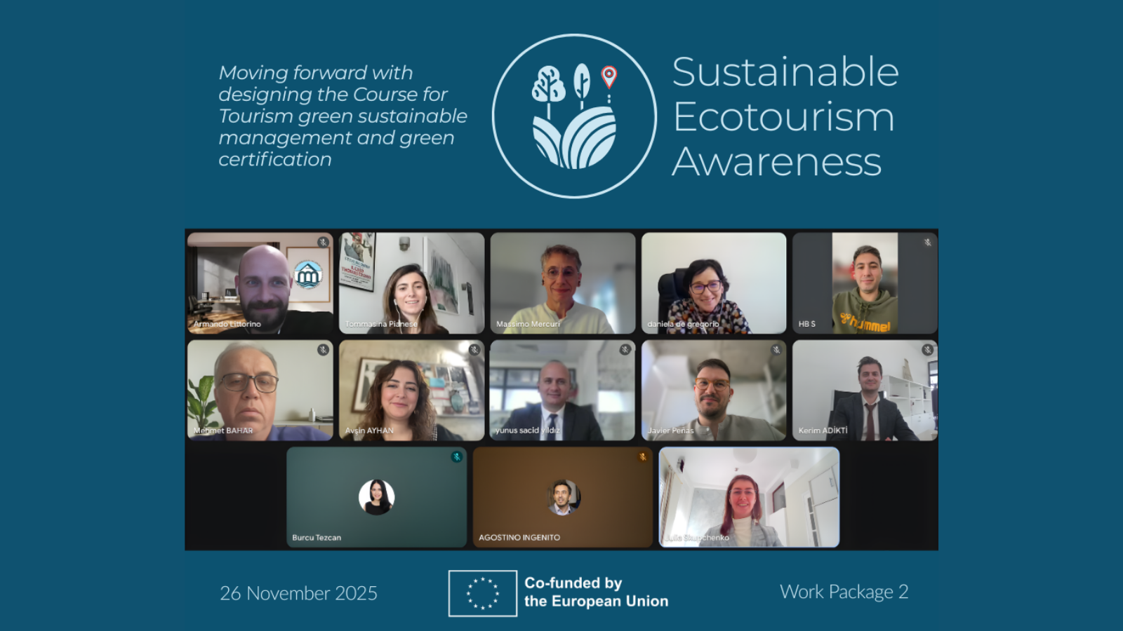 AB tarafından ortak finansman sağlanan Sustainable Ecotourism Awareness projesi kapsamında yürütülen çalışmalar hızla devam ediyor. Konsorsiyum ortakları, 26 Kasım tarihinde çevrim içi olarak bir araya gelerek WP2’nin bir sonraki önemli adımı olan uzman anketlerinin hazırlanmasına ilişkin değerlendirmelerde bulundu. Toplantıya Ahiler Kalkınma Ajansı da aktif katılım sağladı.